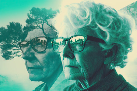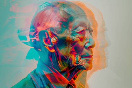 A poignant depiction of a senior man sitting surrounded by photographs that are slowly dissolving into thin air, symbolizing the fading of cherished memories.