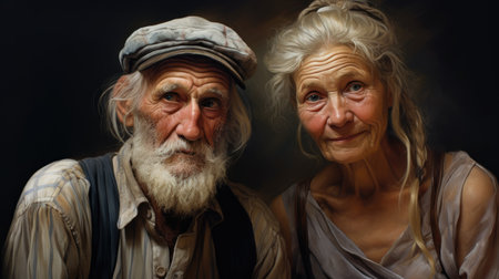 Elegant side profiles: mature woman, senior man with scarf, gazing towards light. Suggests contemplation, shared moments, quiet companionship, dark contrasting background