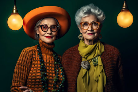 Two retired friends, senior women, pose in a studio with party clothes, make-up in colors and sunglasses.
