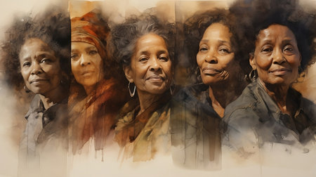Three generations of women smiling in colorful portrait, a painting style artwork showing family bonds, love, and connection, a celebration of womanhood and legacy