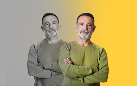 portrait of same young and old man smiling, AI generated image