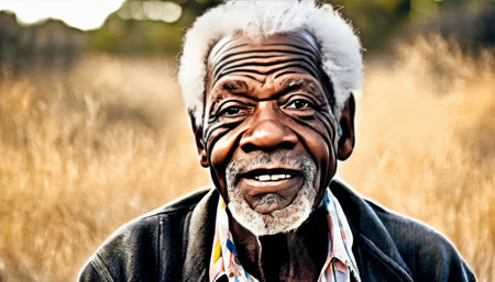 An elderly African man with a warm smile, his face marked by time, stands before a vivid blue background in a rural setting.. AI Generation