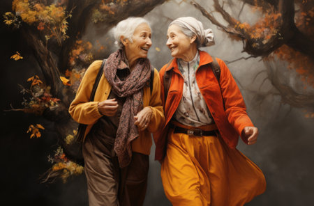 Two elderly women walking in the autumn forest. AI
