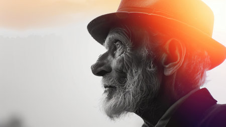 Elderly gentleman with beard in hat, side profile, black and white color tint