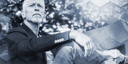 Portrait of handsome mature man sitting on a bench, outdoors, light effect, geometric pattern