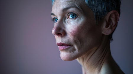 Close up portrait of mature woman with short gray hair and striking blue eyes, exuding confidence and grace. soft background enhances her features, creating serene atmosphere