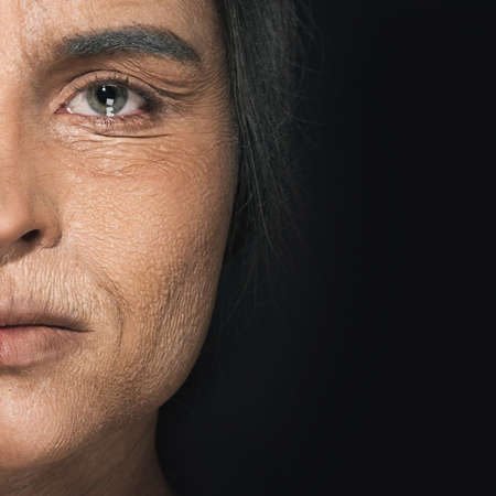 Comparative portrait of woman with smooth young face and aging wrinkled skin isolated over grey studio background. Beauty treatment and lifting. Before and after. Process of aging and rejuvenation