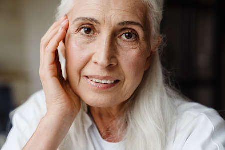 Portrait of senior woman dissatisfied with wrinkles on her forehead, touching face on grey studio background