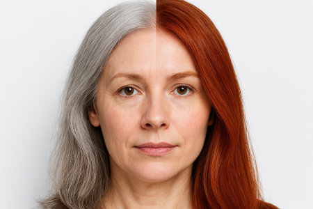 Woman with half gray and half red hair transforming hairstyle concept of hair change, aging, beauty transition, identity change, personal transformation, hair color.