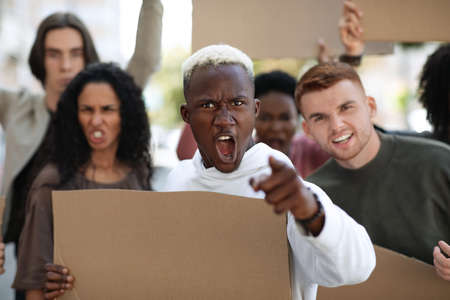 Mutiracial group of demonstrators striking on the street, holding blank placards, pointing at camera. International group of demonstrators fighting against racism, walking by city, chanting slogans