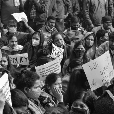 Delhi, India December 25 2021 : Delhi Contractual Guest Teachers with posters, flags and graffiti’s protesting against Delhi AAP Government for making policy, Delhi Teacher protesting Black and White