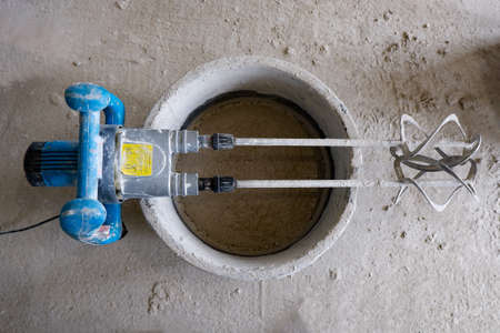 handheld electric concrete mixer on construction site.