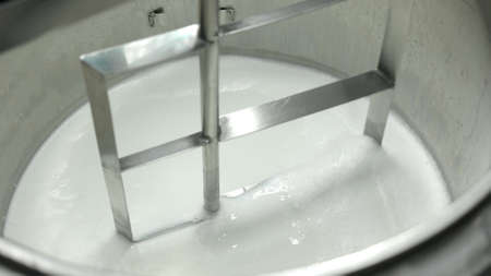 Cheese-making process close up. Modern steel mixing machine boils and mix milk for making cheese at dairy factory. Food industry concept.