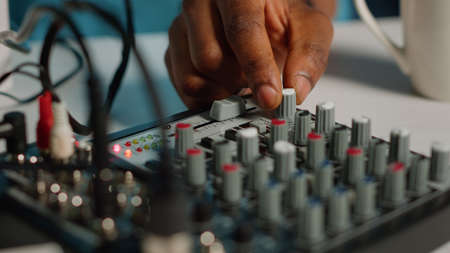 Close-up hands of sound engineer adjusting audio mixing console, tuning input and output levels, balancing sound elements, mastering audio composition and delivering polished audio for listeners.