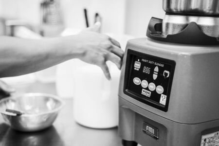 making gelato ice cream with modern professional equipment preparation detail in kitchen interior black and white photo