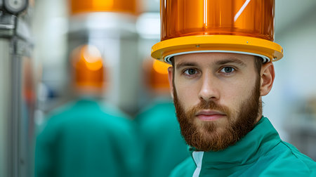 An engineer with a beard, wearing a protective helmet and green jacket, appears serious and focused. The blurred background suggests a high-tech environment, enhancing the atmosphere.
