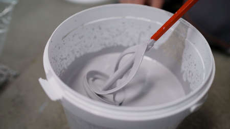 A worker using a mixer mixes the self-leveling floor in a bucket. Stir the solution in a bucket. Bricklayer mixes cement in a bucket. Preparation of a solution for plaster by mixing a mixture of water-based consistency. Self-leveling floor, cooking.