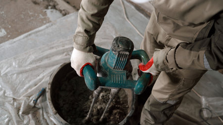 Construction worker wearing protective gloves mixing cement with electric mixer in bucket at construction site
