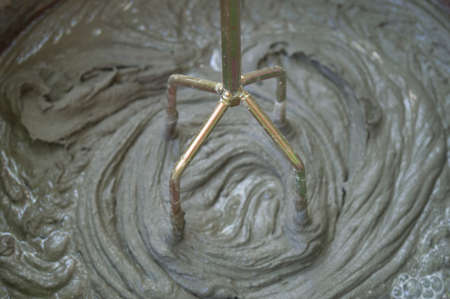 the construction mixer lies on a container with a solution,
