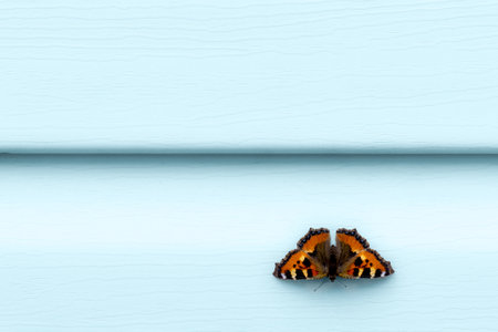 Orange butterfly on surface of cyan plastic siding. close-up. as background. Abstraction