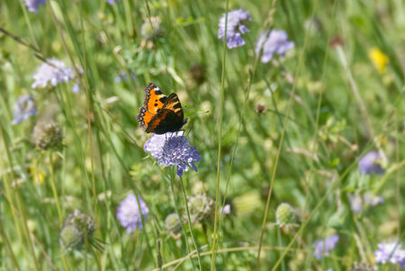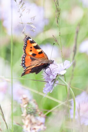 Small Tortoiseshell Butterfly (Aglais urticae) sitting on a small scabious in Zurich, Switzerland