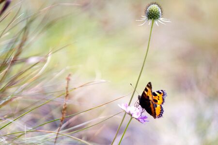 Orange, brown and golden butterfly on a purpe plant in the field