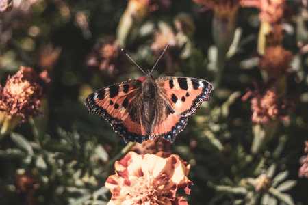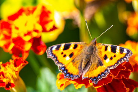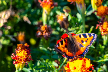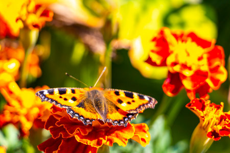 butterfly in shell of small turtle on Tagetes flowers. Collecting pollen and nectar on sunny summer day