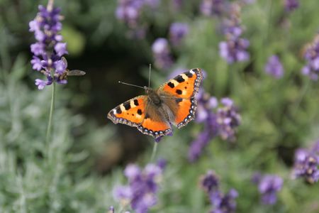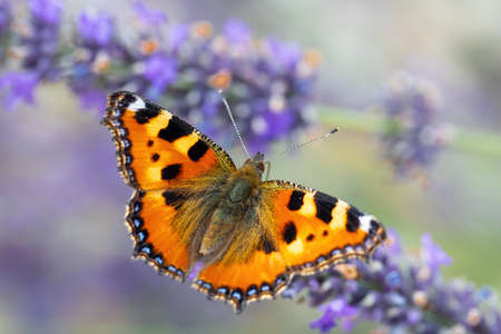 Small beautiful butterfly tortoiseshell (Aglais urticae) on lavender. Europe, Czech Republic wildlife