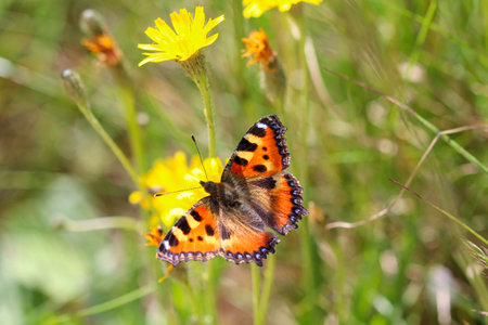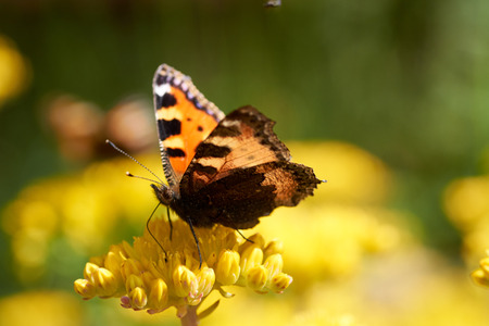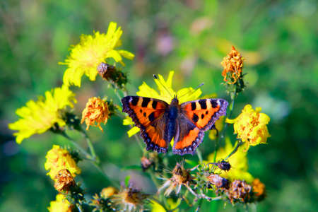 A beautiful orange butterfly small tortoiseshell or Aglais urticae on a yellow flower in a flower garden in the summer day.