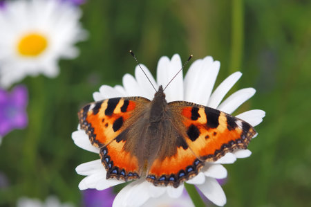 Small tortoiseshell butterfly on flower of daisy