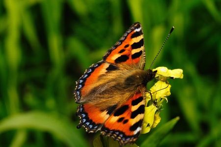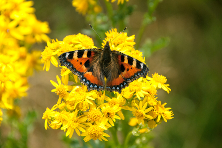 Little fox butterfly on yellow flower blossoms in Mir Karelichy District Hrodna Region.
