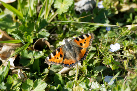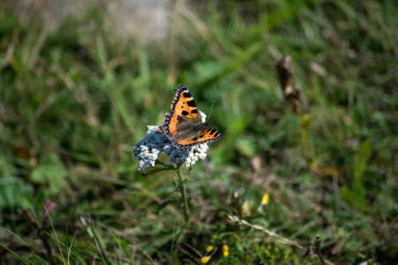 Small tortoiseshell butterfly (Aglais urticae) sitting on a grass field in Zurich, Switzerland