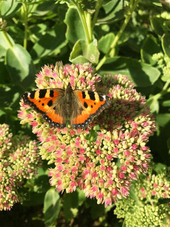 Small tortoiseshell butterfly, Aglais urticae, feeding on pink oregano flowers