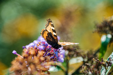 Small tortoiseshell butterfly (Aglais urticae) perched on summer lilac in Zurich, Switzerland