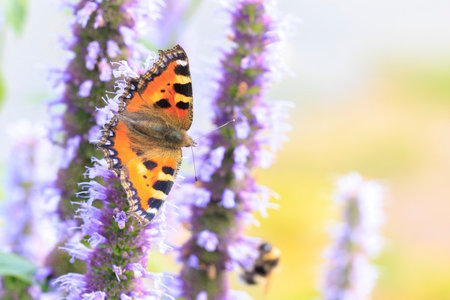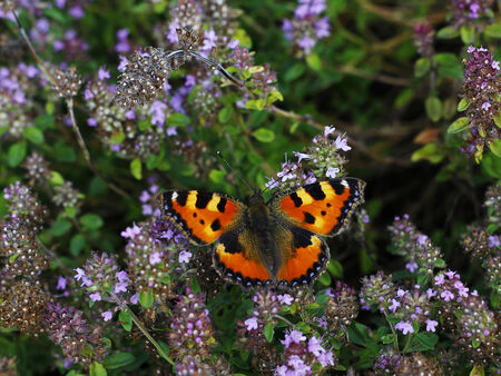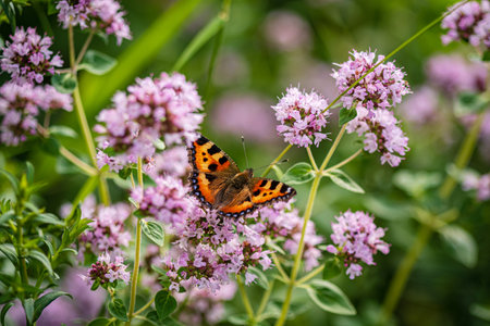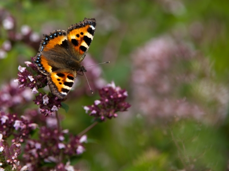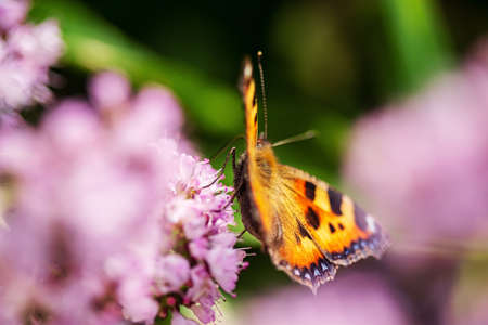 A wonderfulled colored small tortoiseshell butterfly sucking nectar fron the oregano flowers with blurred background, a place for text