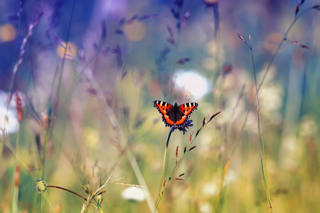 Urticaria butterfly Aglais urticae on blurred background of summer meadow, selective focus, copy space