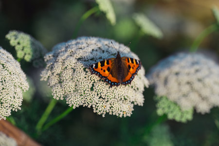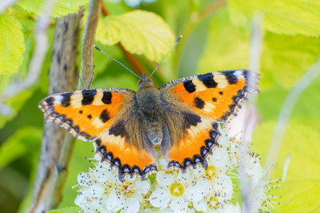Small Tortoiseshell Butterfly (Aglais urticae) sitting on a flowering hedge in Zurich, Switzerland