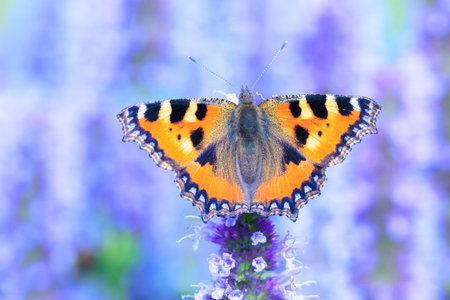 Close-up of the small tortoiseshell Aglais urticae butterfly. Isolated by purple nature