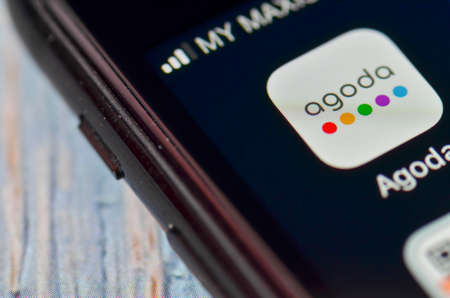 Puchong, Malaysia - July 30, 2019; Close up Agoda App logo on smartphone display.