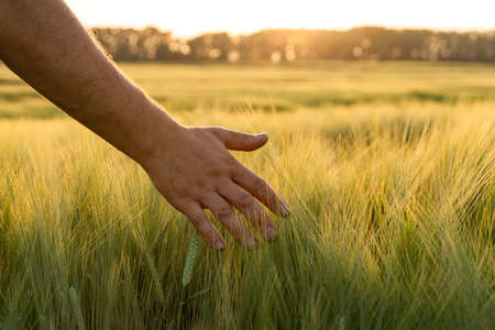 Spikelets of wheat in hands. The man is holding wheat. Green wheat field. Spring landscape. Hand of a farmer touching ripening wheat ears in early summer