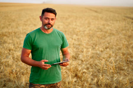 Smart farming using modern technologies in agriculture. Man agronomist farmer with digital tablet computer in wheat field using apps and internet, selective focus