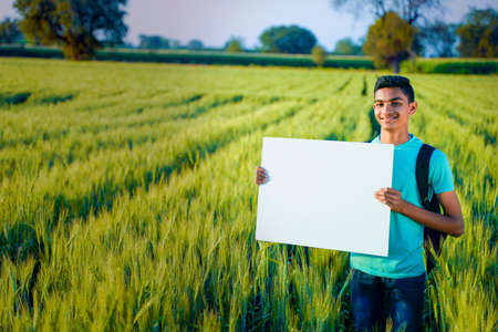 young indian child with blank poster at indian wheat field