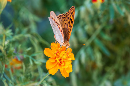 A butterfly, a queen of Spain fritillary, lat. Issoria lathonia, sitting on a red and yellow flower and drinks nectar with its proboscis. Background with a beautiful butterfly collects nectaron a flower.