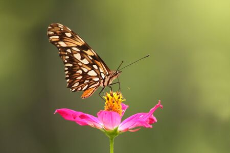 A beautiful orange butterfly sits on a pink flower. Beauty is in nature. The butterfly drinks nectar and pollinates flowers. Natural background.