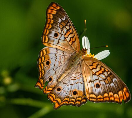 big orange butterflies on a white flower against blurred dark grass. Close up. selective focus.