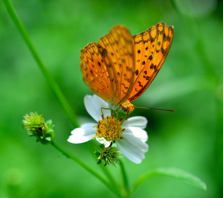 An indian fritillary butterfly feeds from an orange cosmos flower along a river in central Kanagawa Prefecture, Japan.