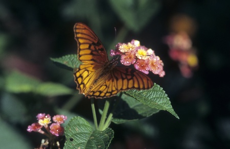Tropical orange butterfly sipping nectar from Lantana flowers.