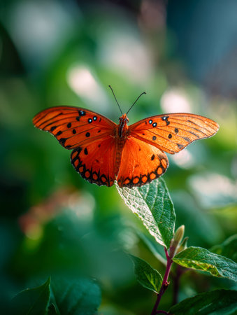 A orange striking butterfly with bold black patterns gently perches on a vivid green leaf, set against a tranquil backdrop of lush garden greenery bathed in warm sun
