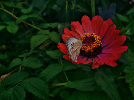 Vanessa Carye butterfly on a red zinnia flower, in the garden
