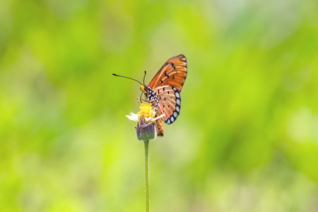 Close up beautiful Butterfly Tawny Coster Acraea violae and white grass flower